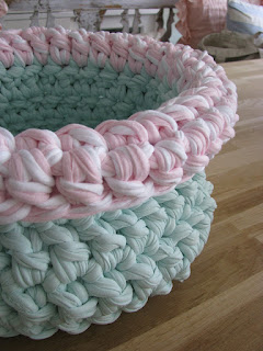 Kolejne prace pochodzą z bloga Old, new, pink and blue. Pufka w kolorze jasnoniebieskiej pasteli jest ciekawie ozdobiona różowym pasmem. Z tych samych kolorów jest zrobiony pokazany niżej koszyczek, z tym, że do różowego Zpagetti dołączone jest także białe pasmo. Zobaczcie jakie fajne efekty można uzyskać dzięki takim połączeniom: